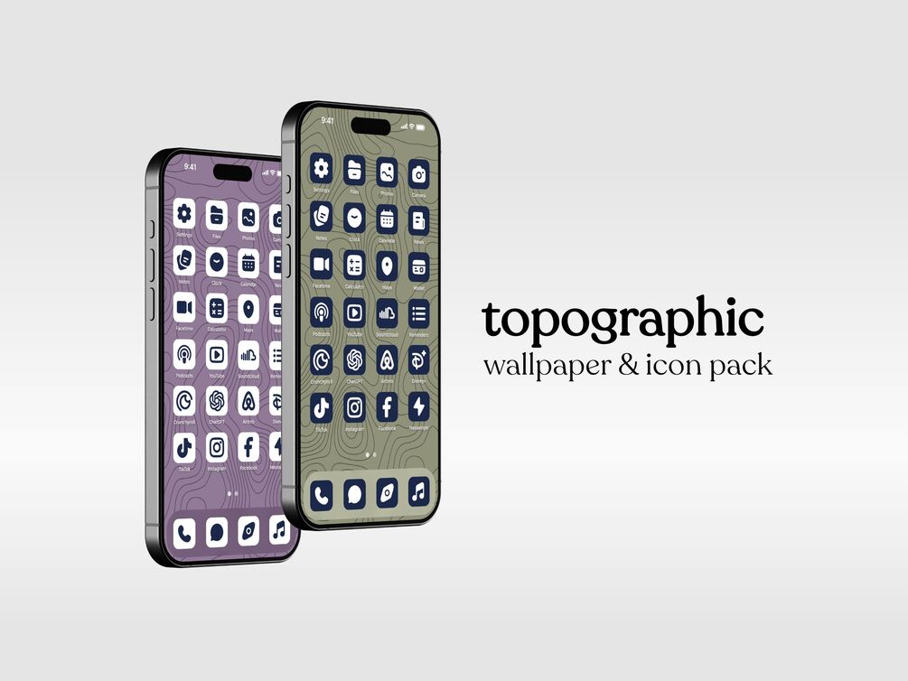 192+ ready to use icons for iPhone in dark and light variations + 12 matching topographic wallpapers