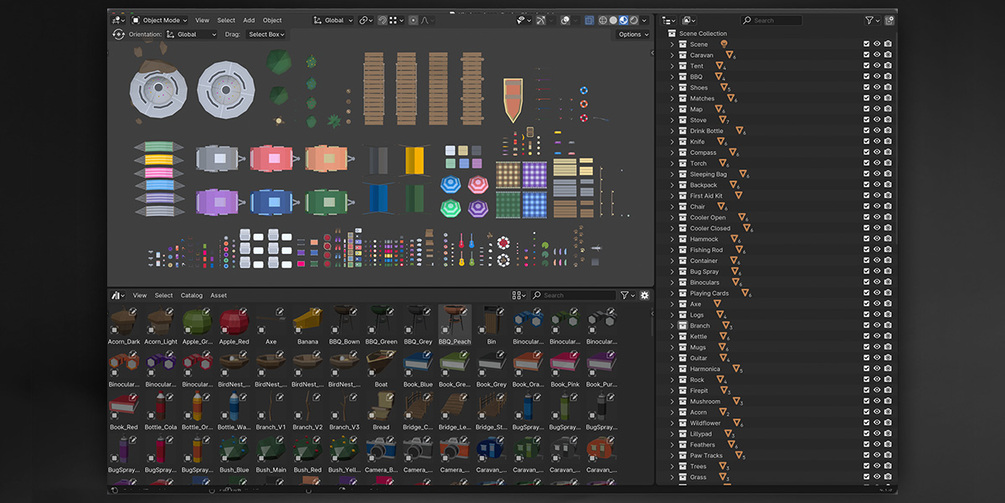 This collection of Camping assets for use in the Blender Asset Library and can be dragged and dropped into any of your Blender scenes! Can also be exported straight out of blender Blender and be used in your game and animation projects in the 3D engine of your choice.